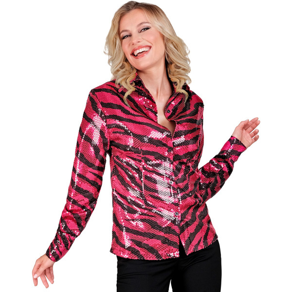 Damska koszula ozdobiona cekinami, wzór zwierzęcy tygrys, kolor fuksja . Skład: 100% poliester.