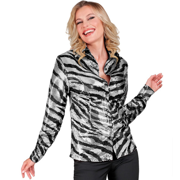 Damska koszula ozdobiona cekinami, wzór zwierzęcy zebra.