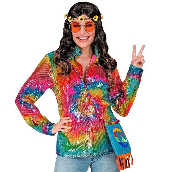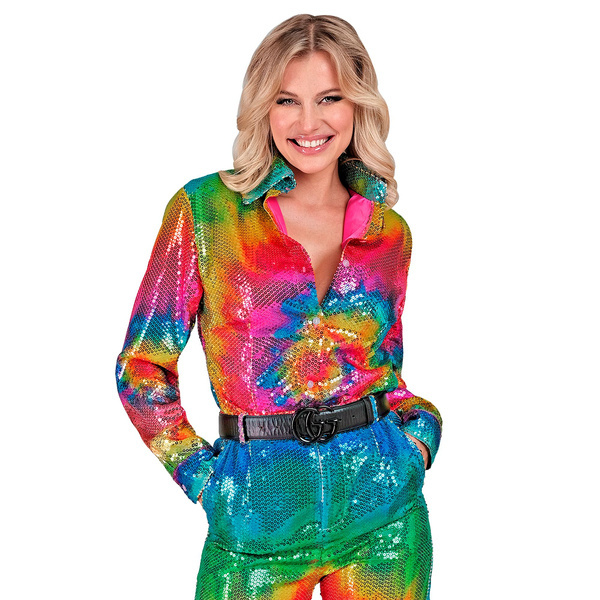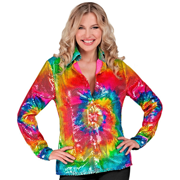 Damska koszula cekinowa w motyw tęczowego wirującego kręgu.