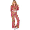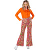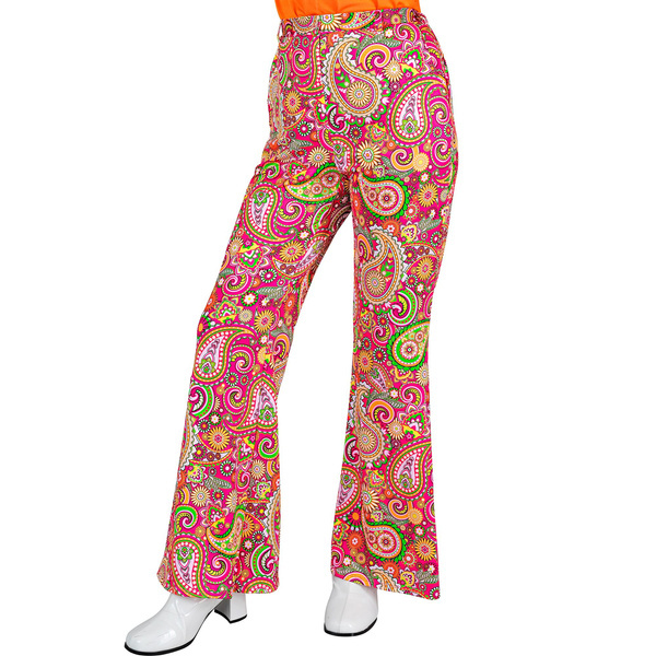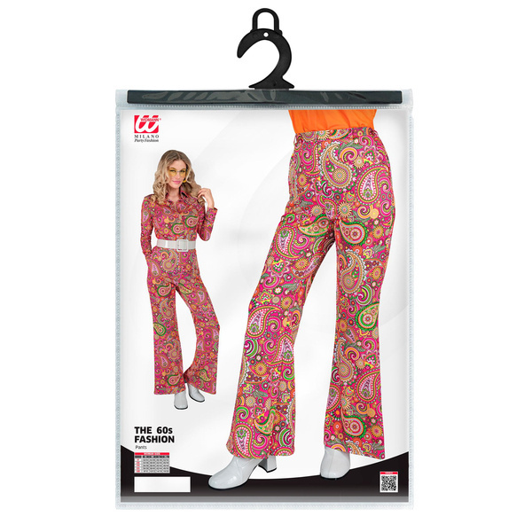 Spodnie damskie w stylu lat 60 70, zdobione łezkami. Kolor dominujący różowy. Skład: 100 % poliester.