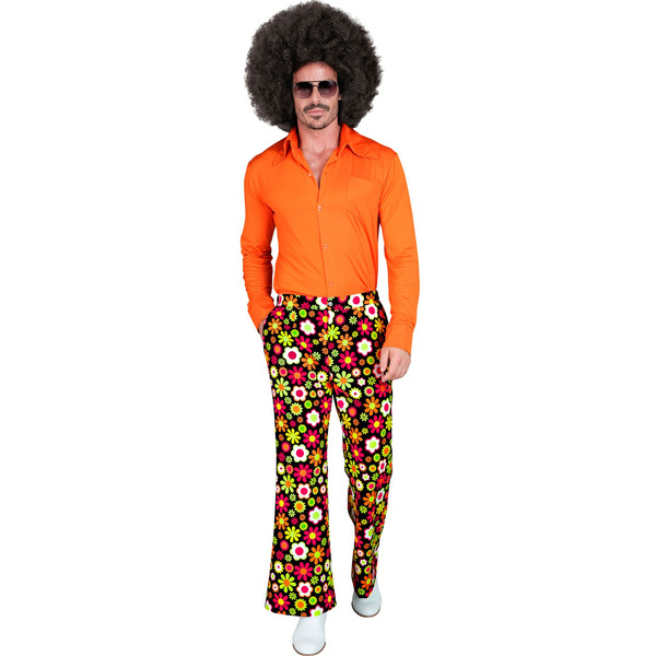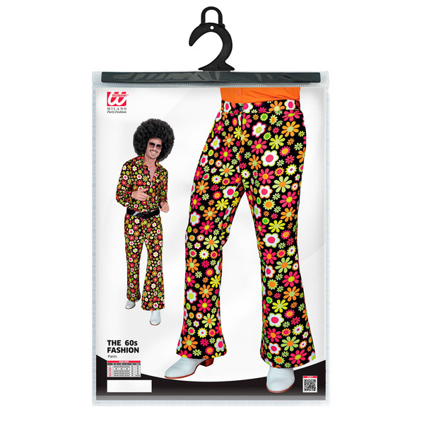 Spodnie męskie w stylu lat 60 70, wzór kolorowych kwiatów. Skład: 100 % poliester.