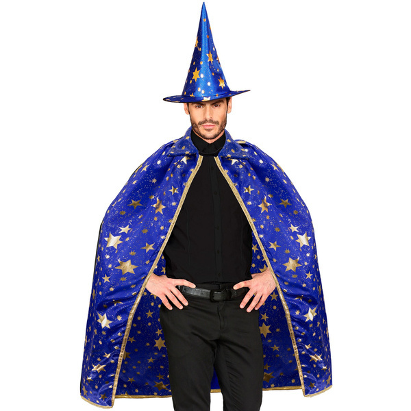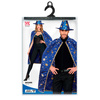 Peleryna oraz kapelusz w kolorze niebieskim w złote gwiazdki. Rozmiar uniwersalny, długość peleryny 85 cm. Produkt unisex.