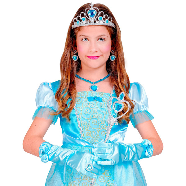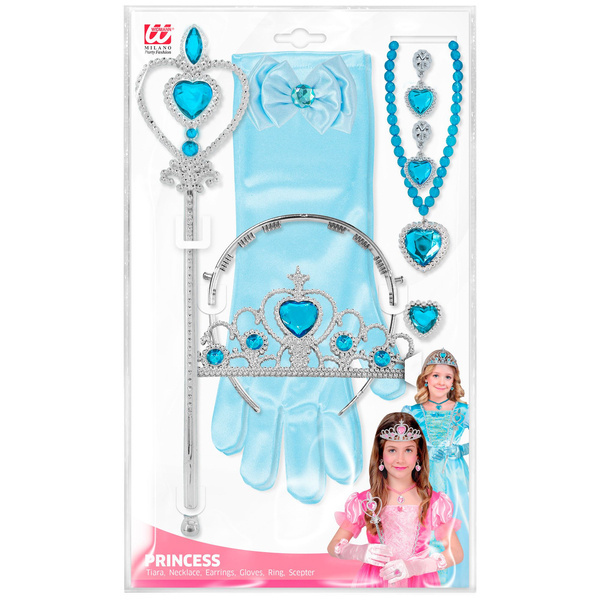 Zestaw księżniczki zawiera: tiarę, kolczyki, naszyjnik, pierścionek, różdżkę i rękawiczki. Kolor: niebieski, srebrny. Idealny zestaw dla każdej małej księżniczki.