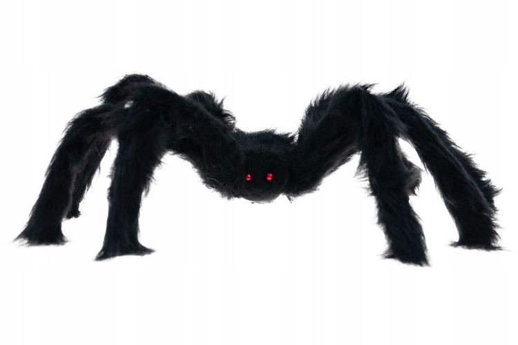 • Włochaty pająk wykonany z tworzywa sztucznego w kolorze czarnym, z czerwonymi oczami.
