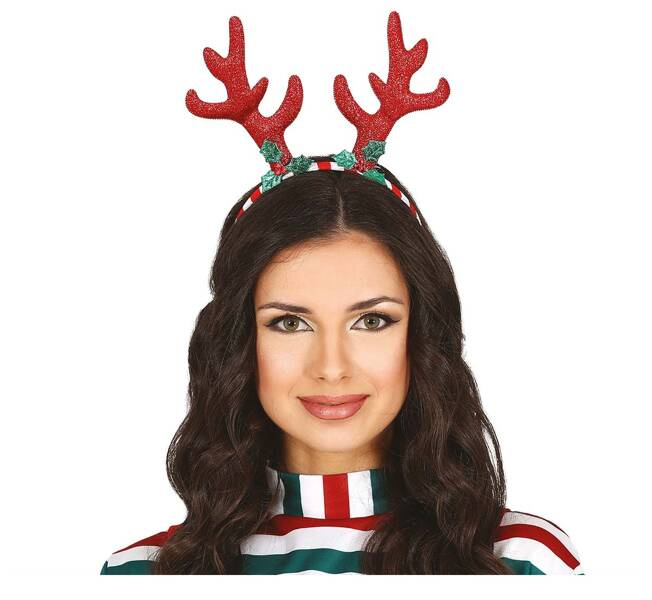 Opaska świąteczna w kształcie rogów renifera ozdobionych jemiołą.