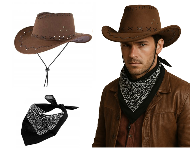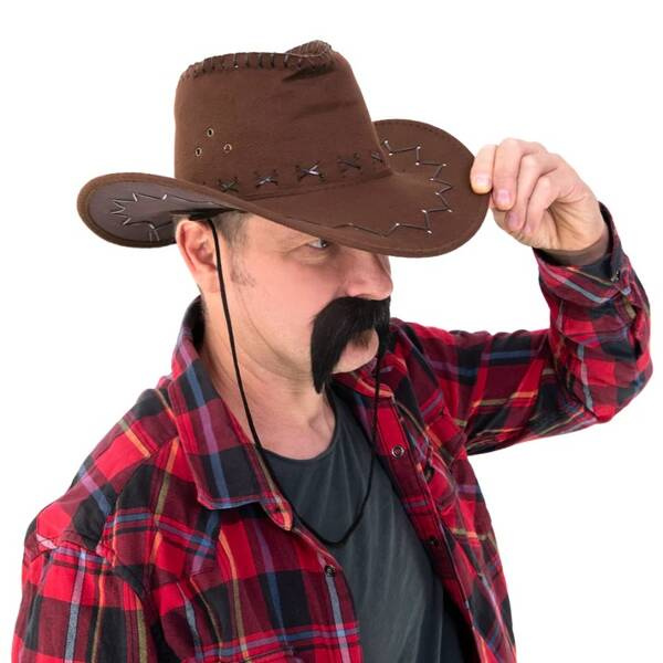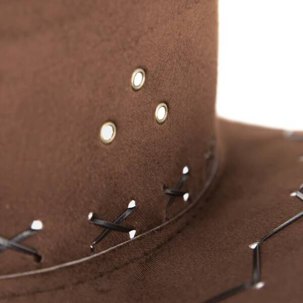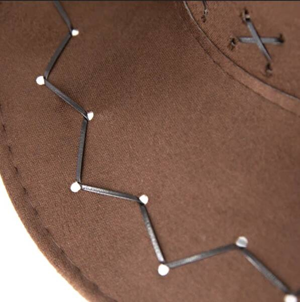 Kapelusz kowbojski wykonany z materiału przypominającego zamsz.