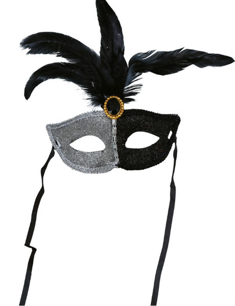 BLACK AND WHITE MASK WITH BLACK FEATHER
