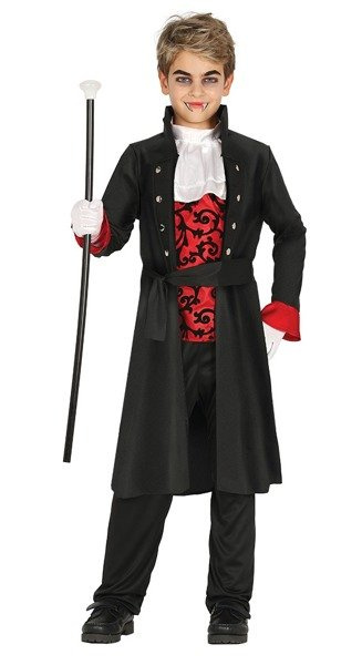 Frak w kolorze czarnym z dużymi klapami, ozdobiony srebrnymi guziczkami, wiązany w pasie. Makiety oraz wszyta koszula w kolorze czerwonym. Koszula posiada czarne al`a welurowe nadruki.