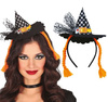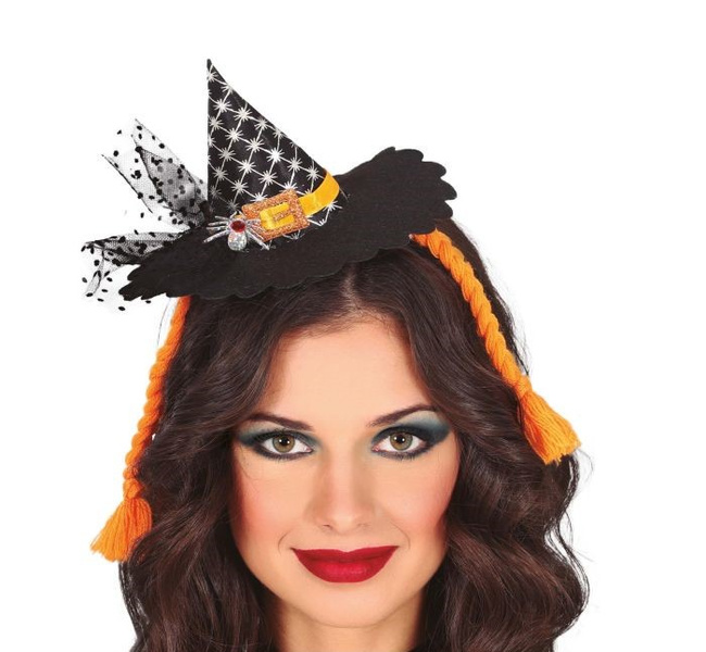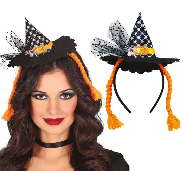 Opaska mini kapelusz czarownicy z pomarańczowymi warkoczykami.