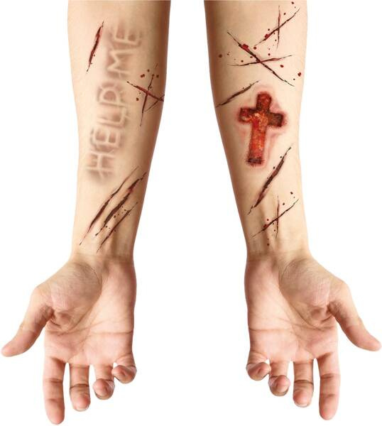 Motyw: cięcia, rany, napis "Help Me", krzyżyk