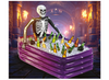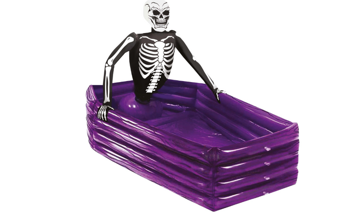 Dmuchana chłodziarka w kształcie szkieletu w trumnie.