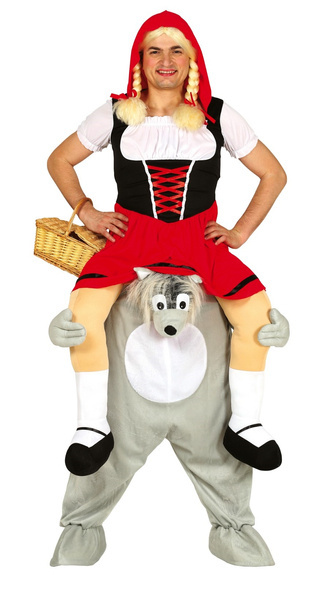 Kombinezon przestawiający czerwonego kapturka, który siedzi na barkach wilka.