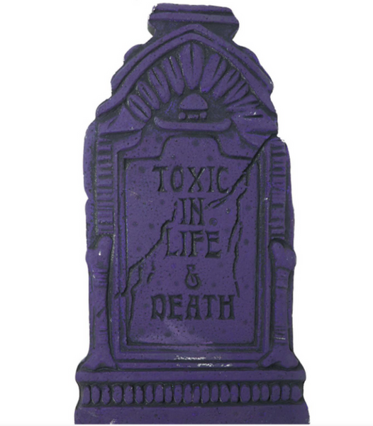 Dekoracyjny nagrobek zdobiony napisem 'Toxic in life & death".