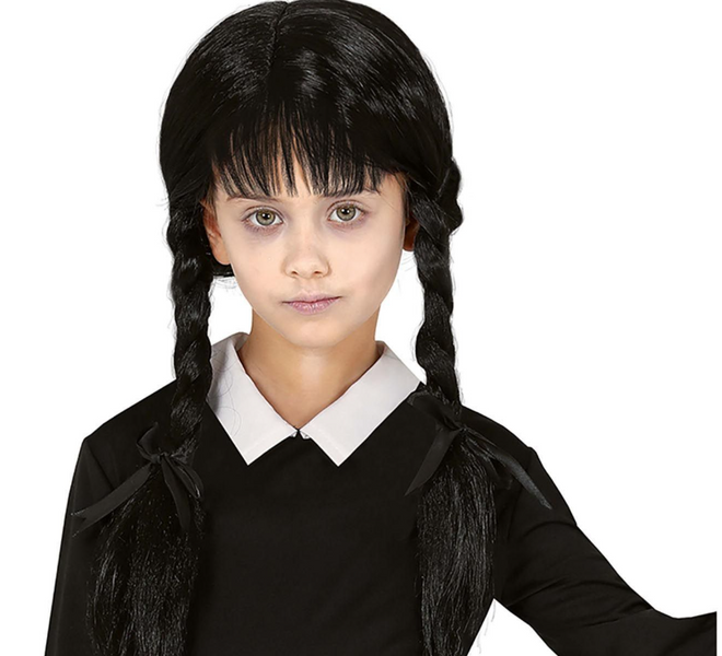 - Czarny kolor i klasyczna gotycka fryzura – grzywka oraz dwa warkocze.