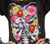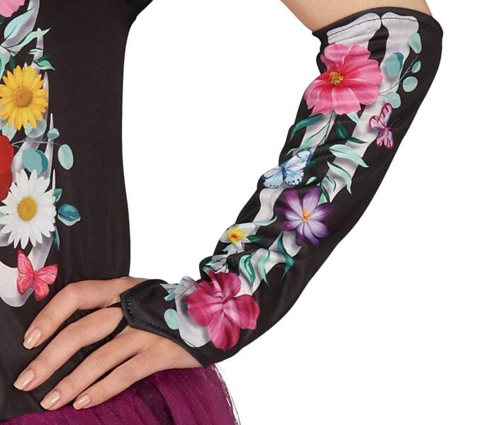 Wzór: nadruki kości oraz kwiatów i motyli.