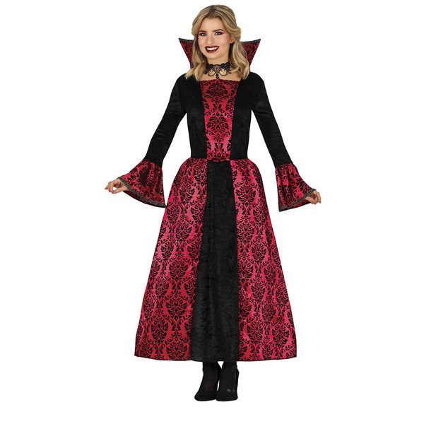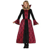 Czarna suknia ze czerwonymi elementami.