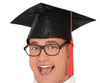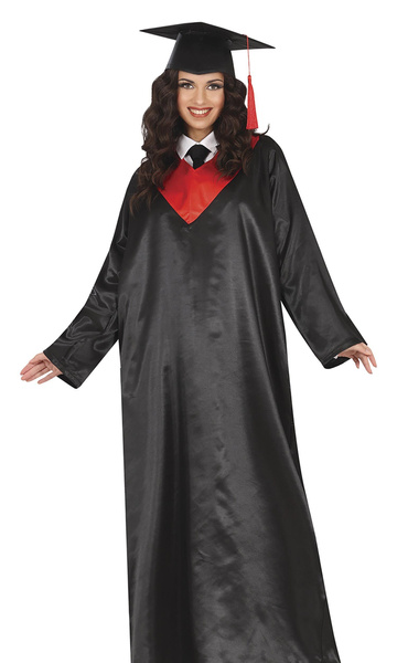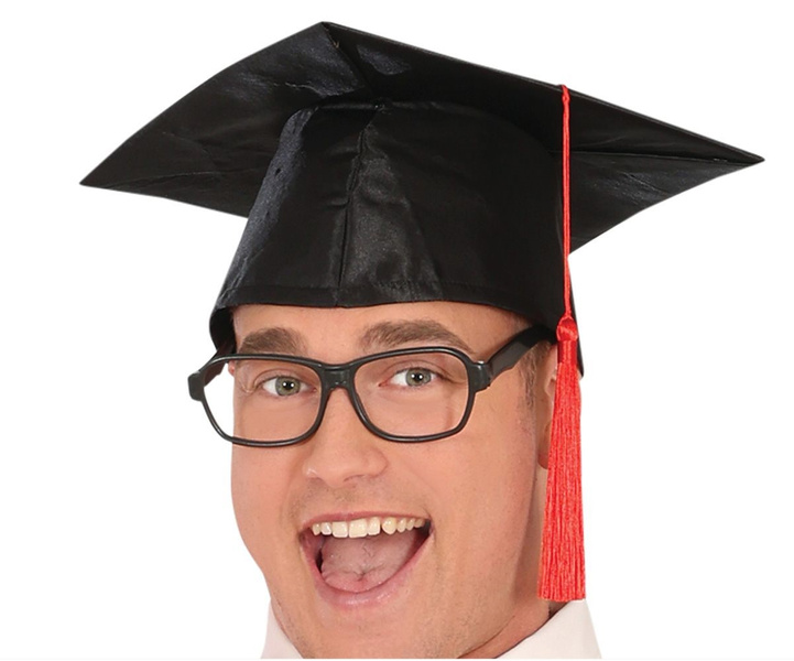 Biret usztywniony czarny z czerwonym frędzlem.