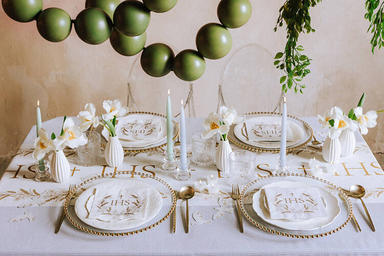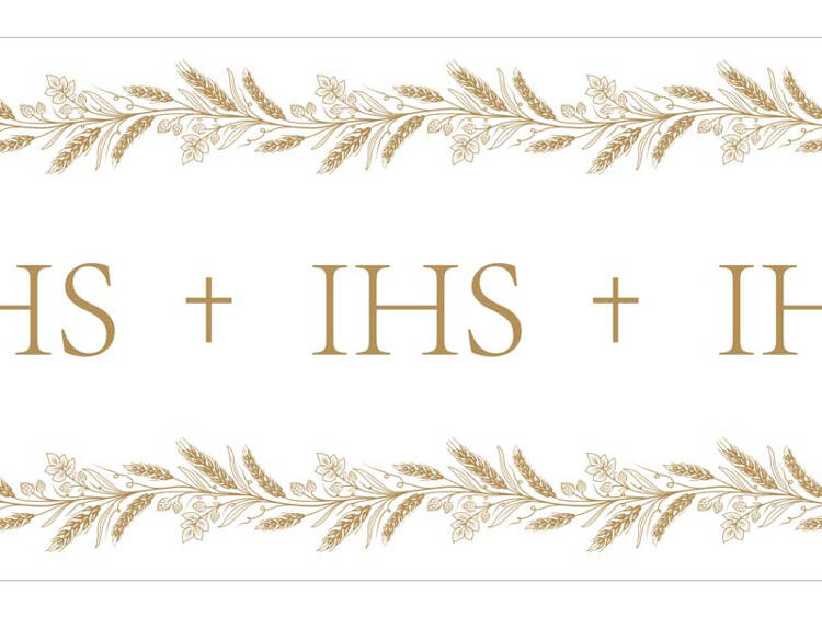 Bieżnik z fizeliny, komunijny w kolorze białym ze złotym nadrukiem.