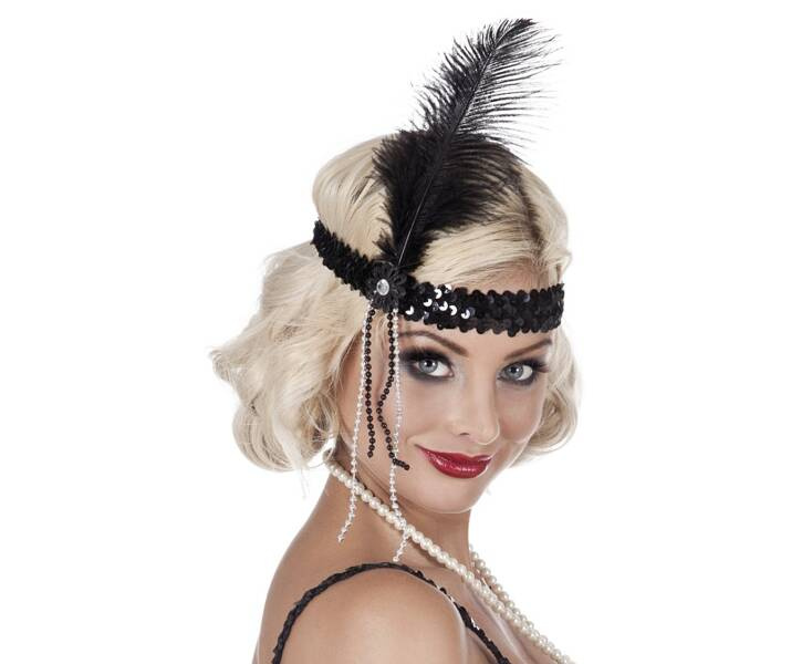 Zdobiona cekinami, koralikami i piórem.
