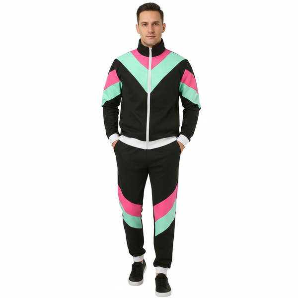 Strój w kolorze czarnym z kolorowymi wstawkami i ściągaczami.