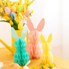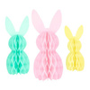 Zestaw stojących zająców w kolorach pastelowych: żółtym, niebieskim i różowym.