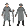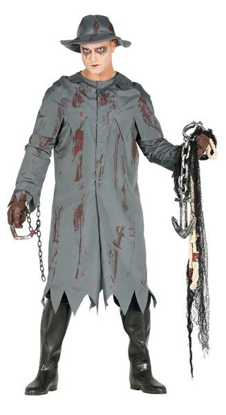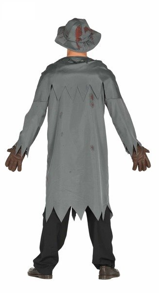 Płaszcz z długim rękawem w kolorze szarym oraz z plamami krwi.