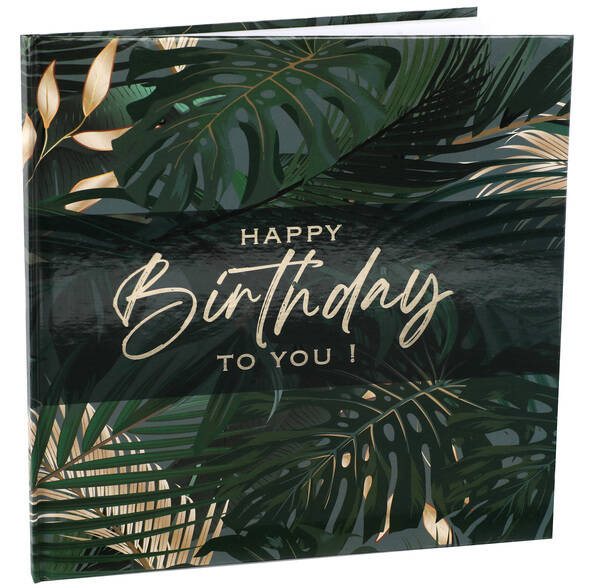 Księga gości w kolorze ciemnozielonym, z nadrukiem liść palmowych oraz złotym napisem Happy Birthday.