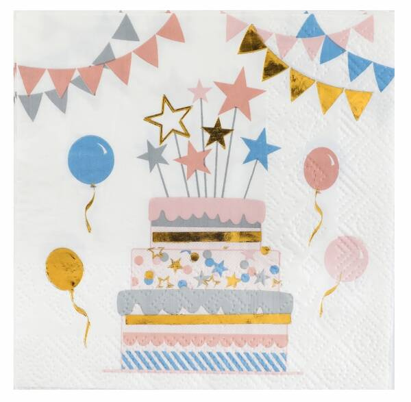 Ozdobione nadrukiem tortu, baloników oraz serpentyn.