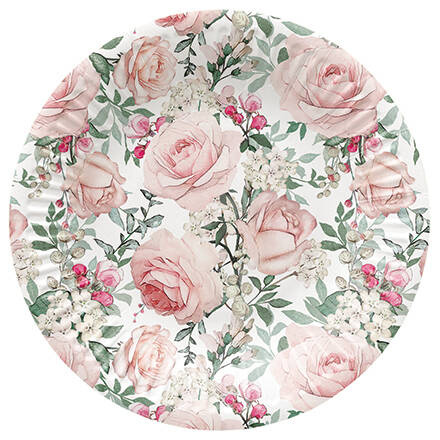 Zestaw talerzyków papierowych w kolorze białym z nadrukiem róż.