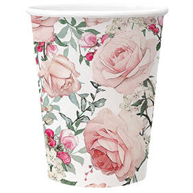 Zestaw kubeczków papierowych w kolorze białym z nadrukiem róż.
