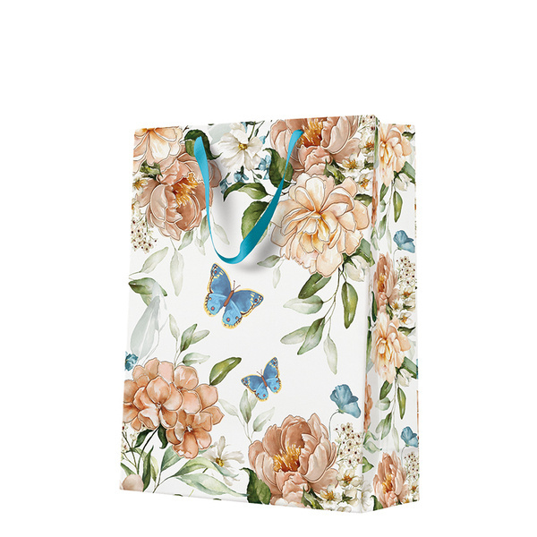 Produkt w kolorze białym, zdobiony niebieskimi motylami oraz kwiatami.