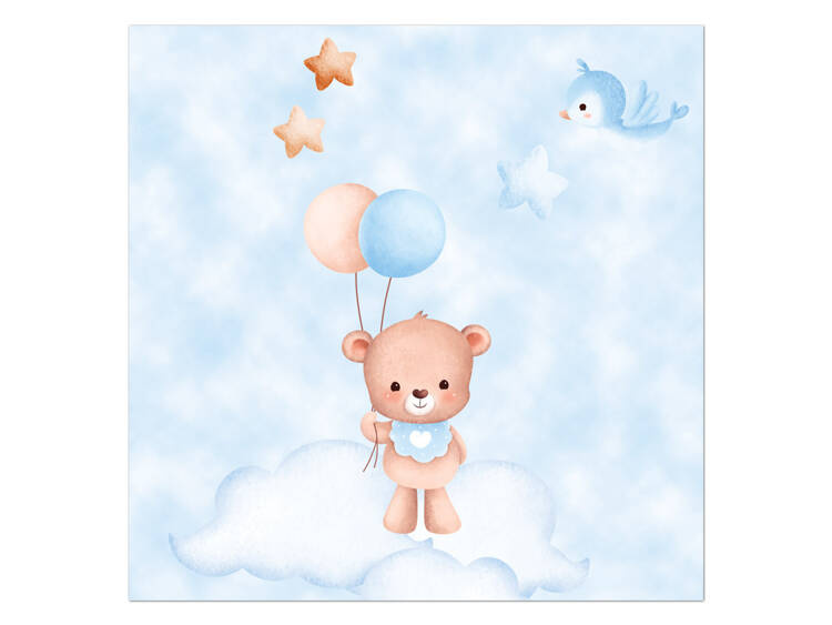 Serwetki papierowe niebieskie z nadrukiem misia z balonikami.