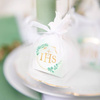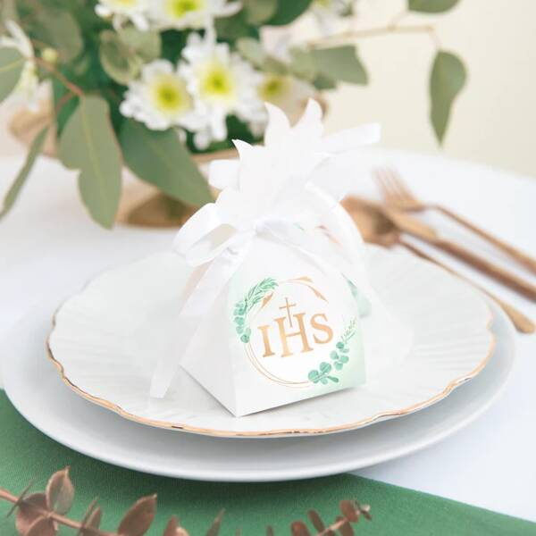 Produkt w kolorze białym, zdobiony złotym napisem IHS oraz gałązkami eukaliptusa.