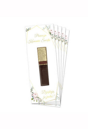 Produkt zdobiony napisem Pierwsza Komunia Święta oraz różowymi różami i listkami.