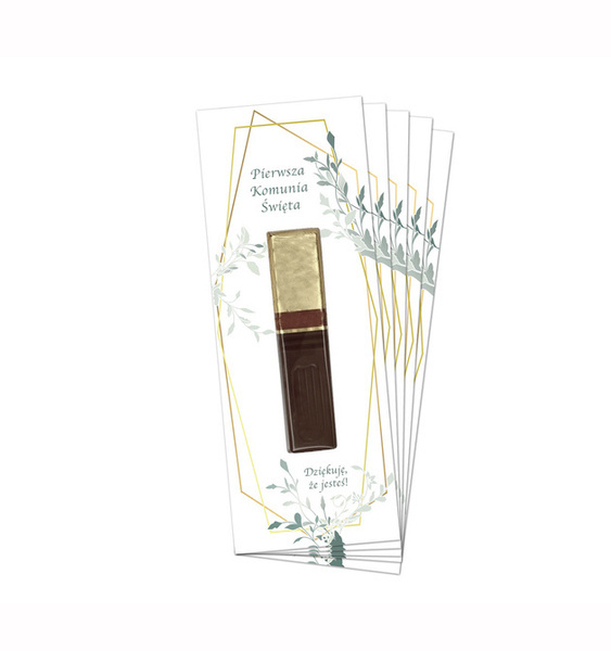 Produkt zdobiony napisem Pierwsza Komunia Święta oraz zielonymi listkami.