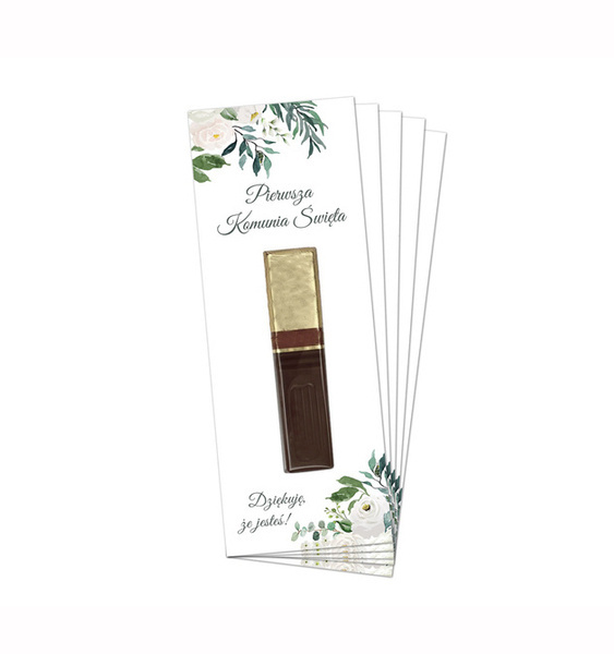 Produkt zdobiony napisem Pierwsza Komunia Święta oraz białymi różami i listkami.