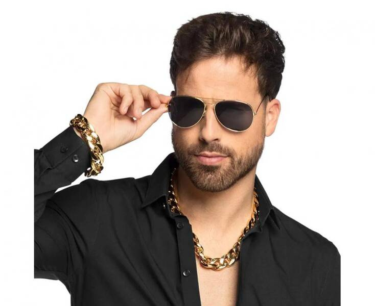 ZESTAW DLA DOROSŁYCH PIMP W skład zestawu wchodzą: naszyjnik, bransoleta, okulary Kolor: czarny, złoty Materiał: plastik Producent: Boland