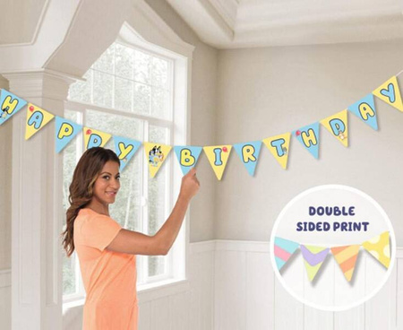 GIRLANDA PAPIEROWA Bluey Długość: 218 cm Wysokość: 12 cm Materiał: papier Kolor: żółto-niebieski W opakowaniu: 1 szt. Producent: Amscan