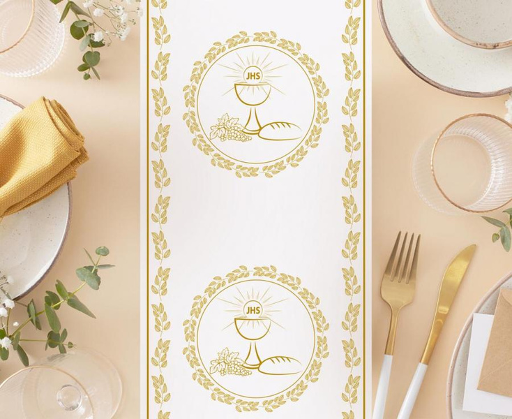 - Elegancki wzór z motywami hostii, kielicha oraz winogron, otoczony dekoracyjnym wieńcem.