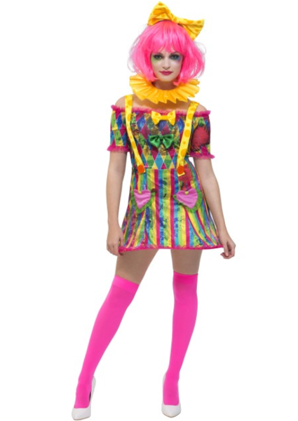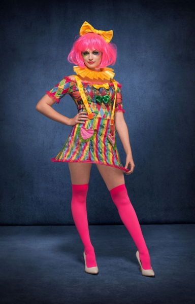 Kolorowa sukienka z obręczą na kole to część stroju pani klaun.