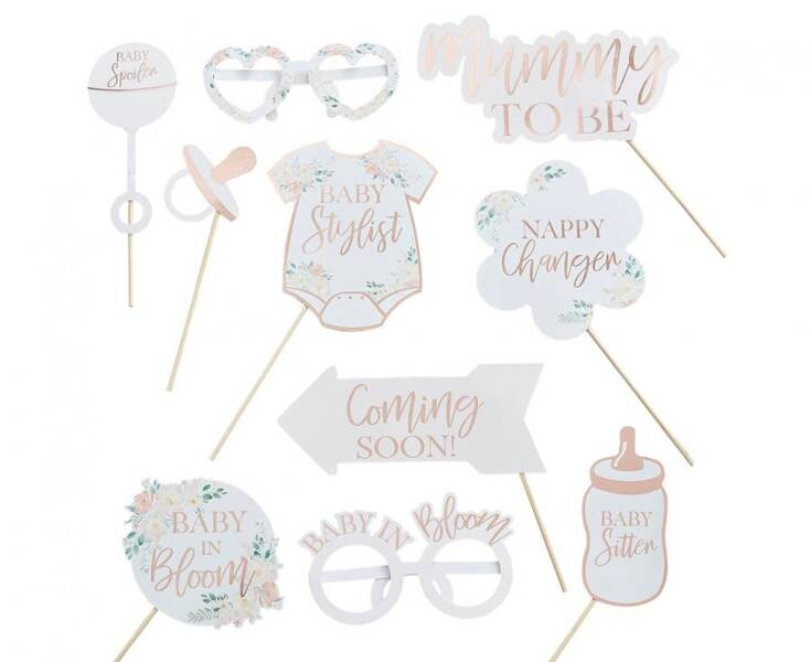 DEKORACJE DO ZDJĘĆ NA BABY SHOWER Kolor: różowo-złoty Materiał: drewno, papier Ilość sztuk w opakowaniu: 10 Producent: Amscan
