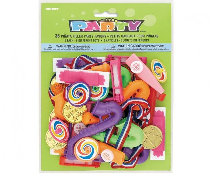 Zestaw zabawek do wypełnienia piniaty Zestaw 36 plastikowych zabawek, służących do wypełnienia piniaty Oprócz słodyczy urodzinowa piniata może zaskoczyć drobiazgami do zabawy Ilość w opakowaniu: 36 części
