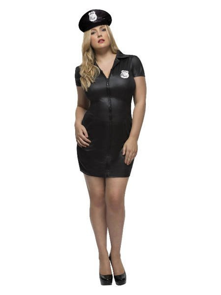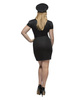 Obcisła, krótka sukienka z krótkim rękawkiem zdobiona srebrną naszywką przypominającą odznakę policyjną.
