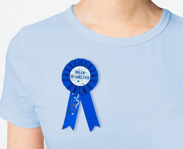 Zdobiony satynową tasiemką w niebieskich barwach.