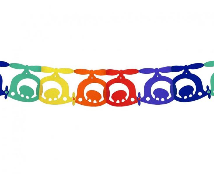 GIRLANDA AŻUROWA W KSZTAŁCIE HELIKOPTERÓW, TĘCZOWA Długość: 400 cm Materiał: papier Kolor: wielokolorowy W opakowaniu: 1 szt. Producent: Godan S.A