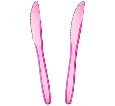 PREMIUM - 24 NOŻE fuksja W zestawie- 24 sztuki. Długość: 18 cm Plastikowe noże w kolorze fuksji. Noże różowe wykonane z grubego plastiku.
