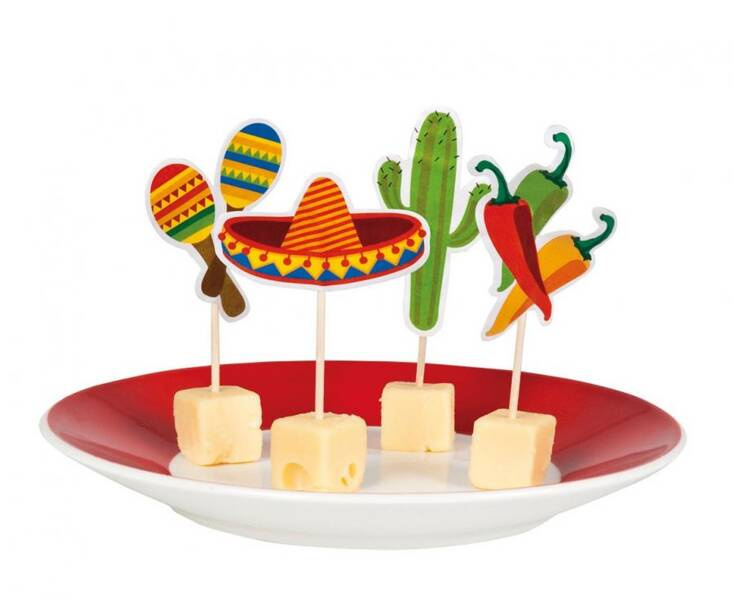 PIKERY KOKTAJLOWE FIESTA Wysokość: 9 cm Ilość sztuk w opakowaniu: 4 Pikery z motywem meksykańskim.