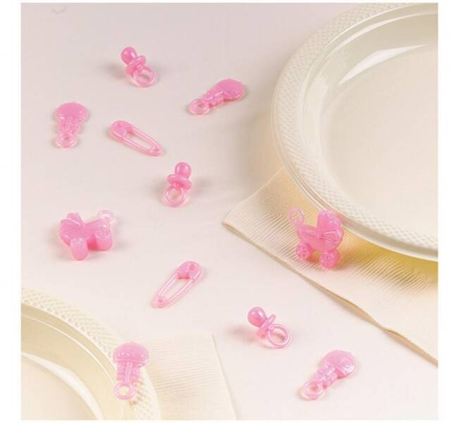 KONFETTI DZIEWCZYNKA Waga: 25 g Konfetti plastikowe w kształcie wózków, smoczków i agrafek. Kolor: różowy. To idealny dodatek dekoracyjny każdego prawdziwego Baby Shower!