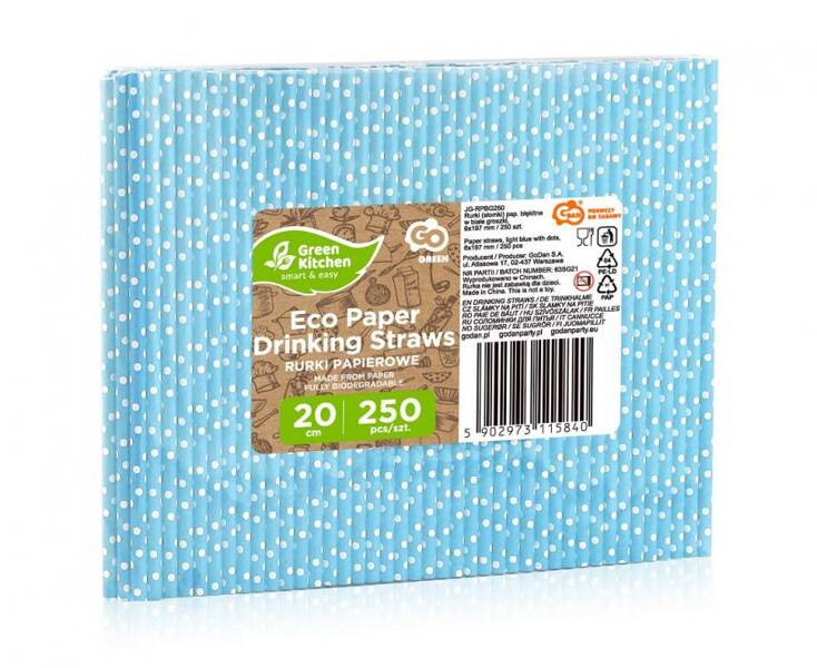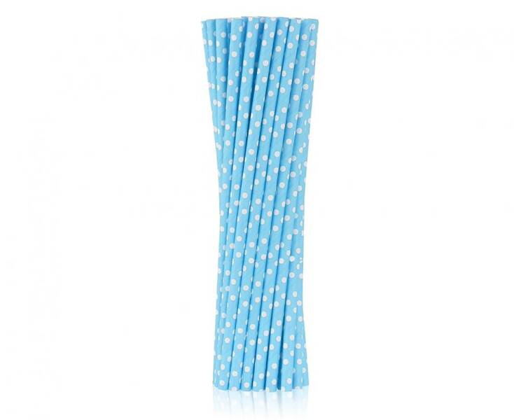 Słomki papierowe w kolorze błękitnym z białymi groszkami.