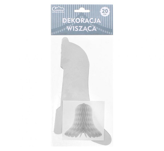 DEKORACJA WISZĄCA DZWONEK Wysokość: 20 cm Ilość sztuk w opakowaniu: 1 Kolor: srebrny. Dekoracja w kształcie srebrnego dzwonka.